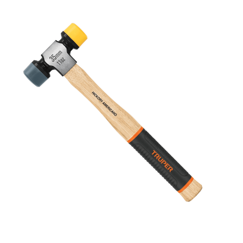 Martillo con mango de madera y grip antiderrapante diseñado para golpear superficies delicadas sin dañarlas. Tiene dos caras, su cara amarilla de polipropileno para golpes sólidos con una dureza 70 shore D y su cara gris de TPR para golpes suaves con dureza 20 shore D