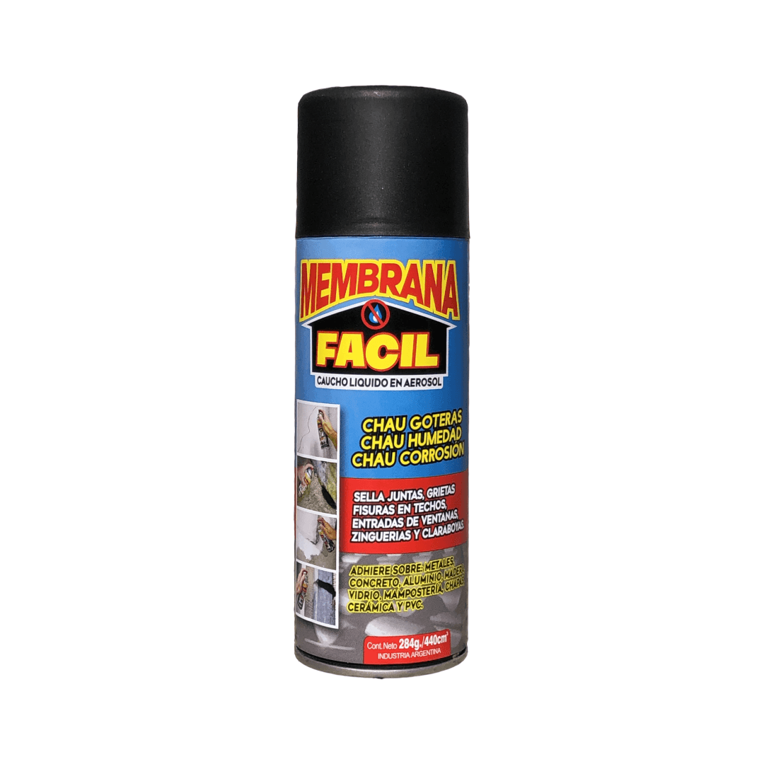 Membrana fácil es una pintura de caucho líquido e impermeable en aerosol. Fue elaborada específicamente para sellar juntas, grietas, fisuras en techos, entradas de ventanas, zinguerias y claraboyas, evitando la penetración de humedad, goteras, óxido y corrosión. Puede pintarse con pinturas látex o al aceite.