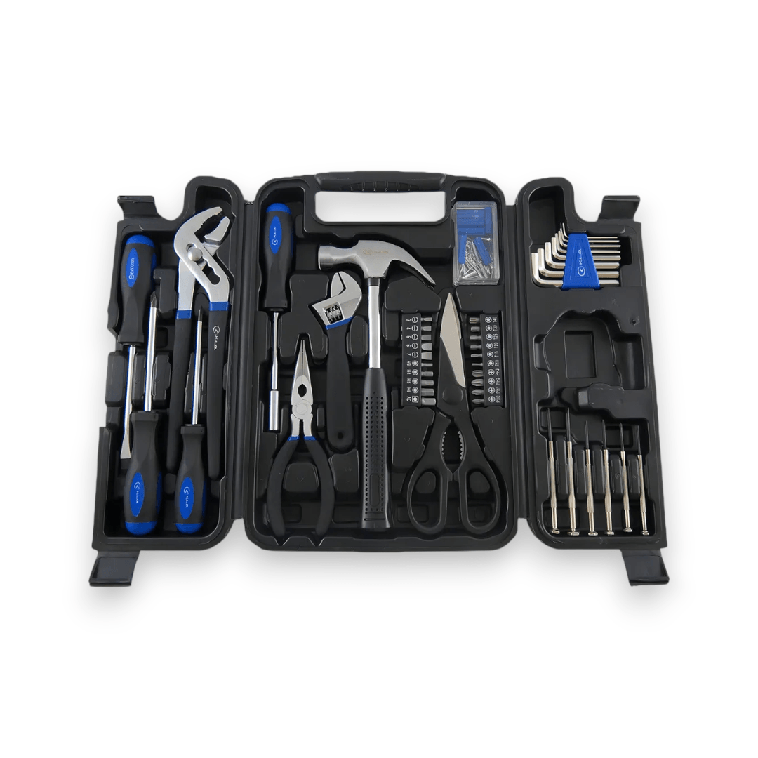 Todas las piezas vienen organizadas en un práctico maletín/caja plegable, lo que facilita tanto el guardado como el transporte. Al abrirlo, cada herramienta tiene su lugar, por lo que es mucho más fácil encontrar lo que necesitás sin perder tiempo buscando en cajones o cajas sueltas.