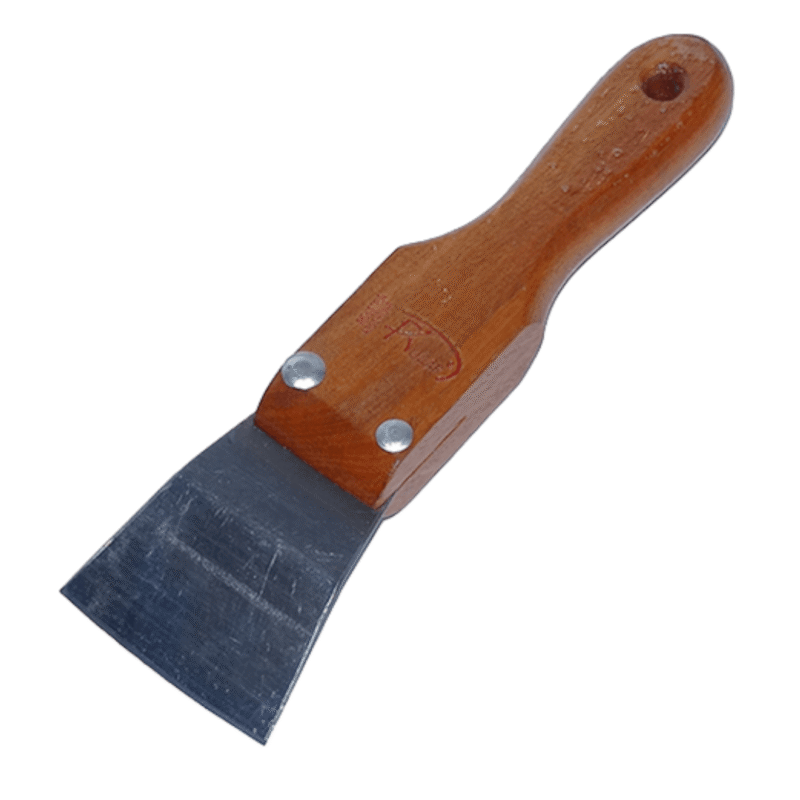 Herramienta tipo espátula fabricada con acero. Los cabos son de quebracho blanco del sur de nuestro país, barnizados, encabados y controlados artesanalmente.