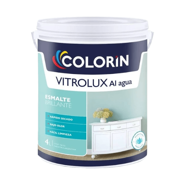 Vitrolux al agua Esmalte brillante: es un producto de base acuosa con excelente poder cubritivo. Puede aplicarse en superficies de metal como en maderas de interiores y exteriores. Posee un excelente anclaje y terminación. Se destaca por su bajo olor y rápido secado.