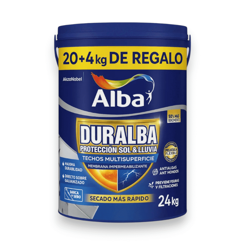 La Membrana Líquida Duralba Techos Multisuperficie está formulada para impermeabilizar losas, terrazas, techos de chapa y hormigón, creando una capa flexible, resistente y duradera frente a la intemperie. De rápido secado, bajo olor y gran rendimiento, se adapta a múltiples superficies asegurando protección a largo plazo.